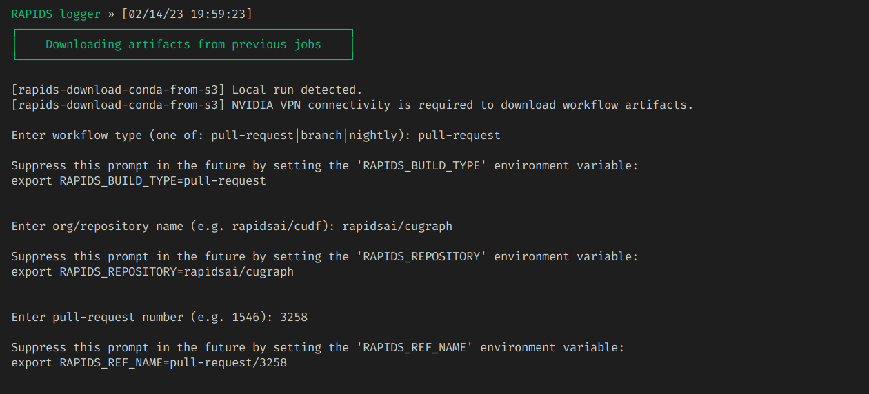 Any time the rapids-download-{conda,wheels}-from-github command (e.g. here) is encountered in a local test run, the user will be prompted for any necessary environment variables that are missing.