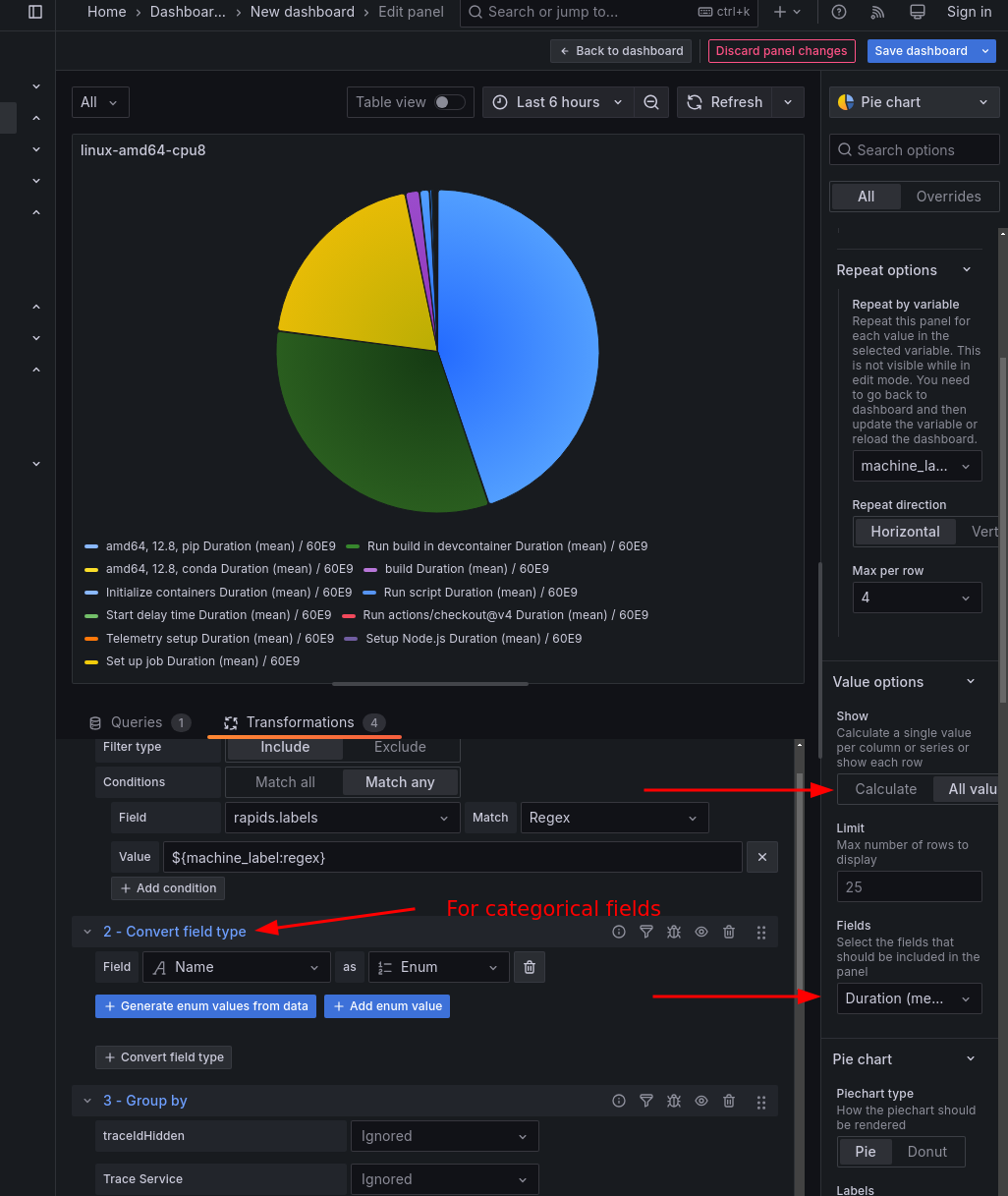 Grafana has something called “dashboard variables,” which serve to select some value for a particular dimension. Using this as the input to the data filters makes it easy to make multiple plots for different values of the variable (e.g. different machine labels or different RAPIDS repos)