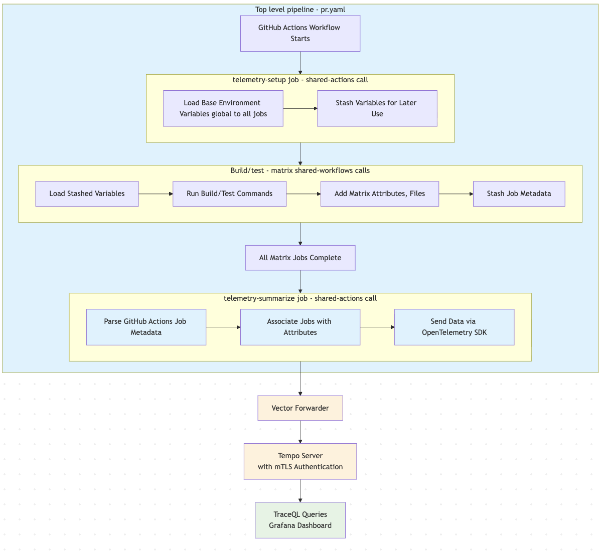 telemetry-setupjob runs first, creating base environment variables - Execution Phase: Reusable workflows load variables, add metadata, and execute build/test operations. They stash results to be associated with spans later.